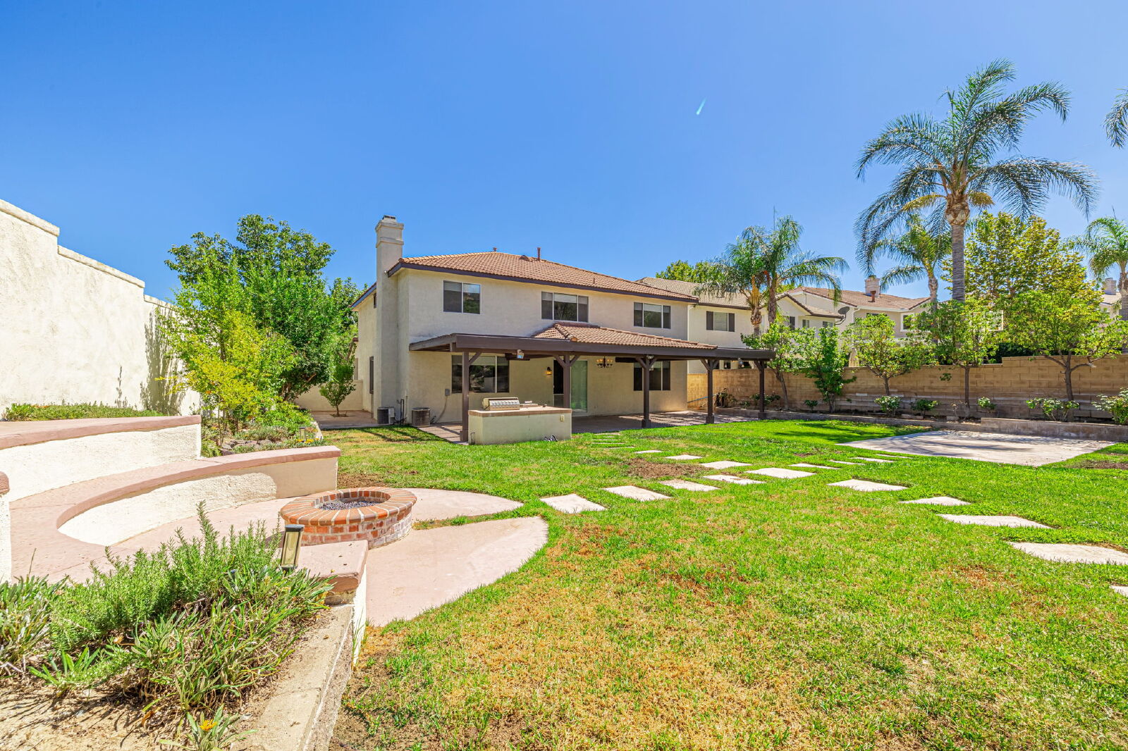 The adjoining family room is warm and inviting with recessed lighting, ceramic tile flooring, and a brick fireplace. Sliding glass doors open to a resort-style backyard, complete with a covered patio, built-in BBQ, fire pit, and a sparkling pool and spa.