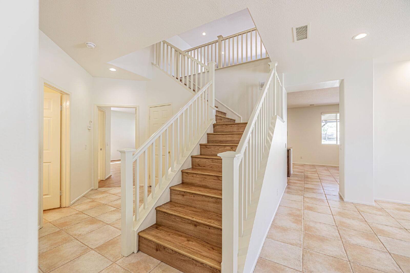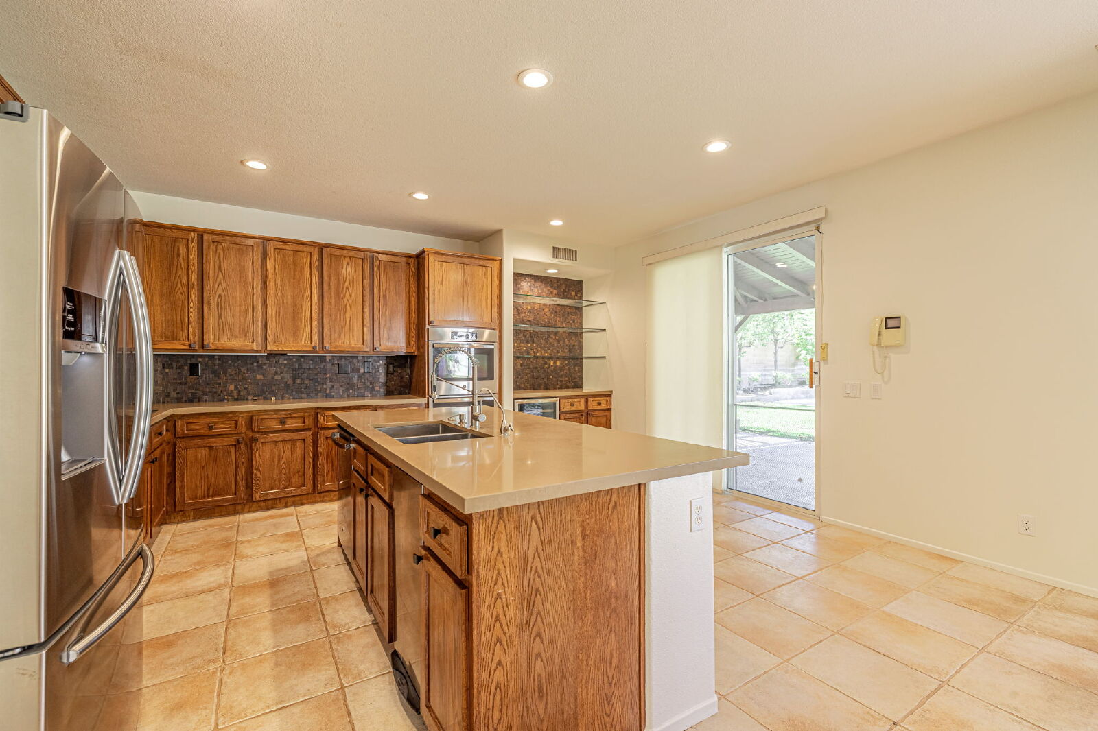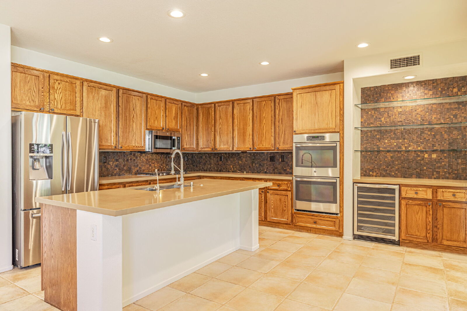 Step inside to a bright and open formal living and dining area with elegant ceramic tile flooring. The gourmet kitchen has been tastefully remodeled and features quartz countertops, a large center island, recessed lighting, and upgraded stainless steel appliances—including a double convection oven, dishwasher, microwave, trash compactor, and refrigerator. A butler’s pantry with a wine refrigerator and glass shelving provides the perfect touch for entertaining.
