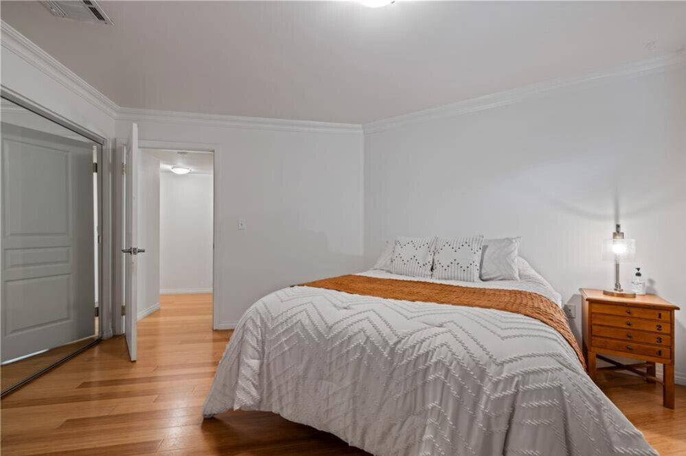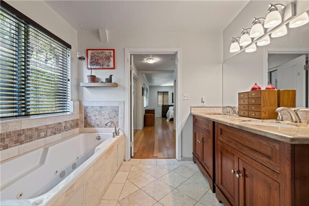 The generously sized primary bedroom is filled with natural light and offers ample closet space along with a well-appointed en-suite bathroom featuring double vanities, granite counters, a separate shower, and a jetted soaking tub.